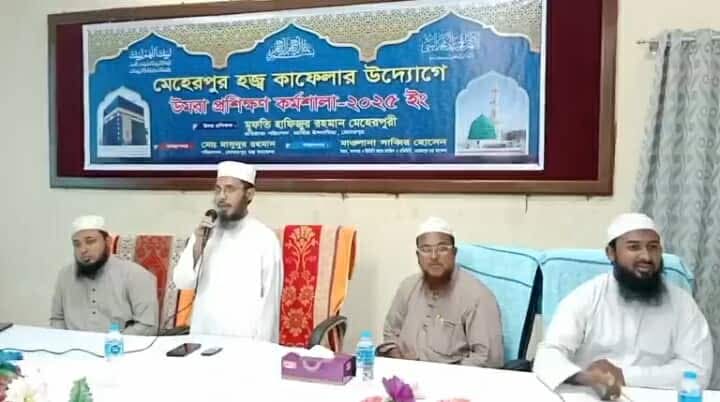 মেহেরপুর হজ্ব কাফেলার উদ্যোগে উমরা প্রশিক্ষণ কর্মশালা অনুষ্ঠিত হয়,শুক্রবার ৩ অক্টোবর-২০২৫ সকালে ইসলামিক ফাউন্ডেশন ও ইসলামী সংস্কৃতি কেন্দ্রে এ কর্মশালা আয়োজন করা হয়,মেহেরপুর জামিয়া ইসলামিয়া মাদ্রাসার প্রতিষ্ঠাতা পরিচালক মুফতি হাফিজুর রহমান মেহেরপুরী প্রশিক্ষক হিসেবে উপস্থিত থেকে প্রশিক্ষণ প্রদান করেন, অনুষ্ঠানের সঞ্চালনা করেন মেহেরপুর আনসার ভিডিপি জামে মসজিদের ইমাম মাওলানা সাব্বির হোসেন, স্বাগত বক্তব্য রাখেন হজ্ব কাফেলার পরিচালক মোঃ মাসুদুর রহমান।