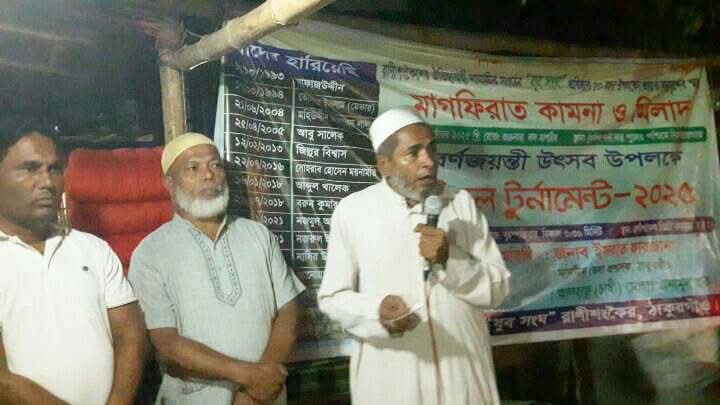 ঠাকুরগাঁওয়ের রানীশংকৈলে ঐতিহ্যবাহী যুব সংঘ ক্লাবের আয়োজনে ১০ অক্টেবর শুক্রবার সন্ধ্যা ৭টায় কুলিক নদী মার্কেটে আলহাজ্ব চাষি এনামুল হকের সভাপতিত্বে যুব সংঘ ক্লাবের ৫০ বছর পুর্তিতে সুবর্ণ জয়ন্তী উপলক্ষে যুবসংঘ ক্লাবের যে সকল সদস্যরা মৃত্যু বরন করেন তাদের স্বরনে এক আলোচনা সভা এবং মাগফিরাত কামনা ও দোয়া অনুষ্ঠিত হয় | উক্ত অনুষ্ঠানে উপস্থিত ছিলেন যুব সংঘের সাধারণ সম্পাদক অতুল বসাক যুগ্ন সাধারণত সম্পাদক নুর আলম,সদস্য অধ্যক্ষ মহাদেব বসাক,সহকারি অধ্যাপক প্রশান্ত বসাক,মোঃ আলম,মান্নাব আলী,