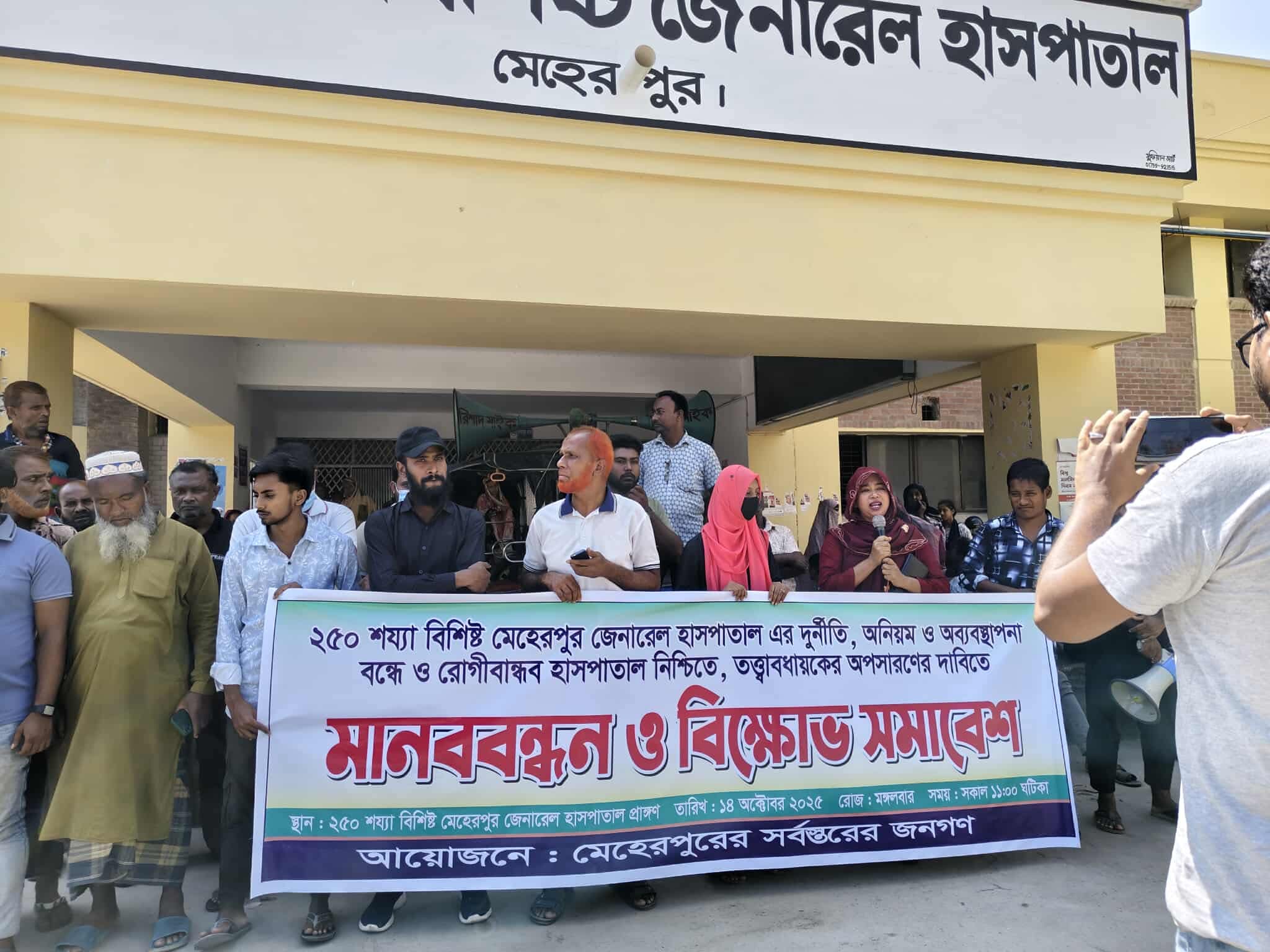 ​আজ সোমবার দুপুরে মেহেরপুরের সর্বস্তরের জনতা ও সচেতন নাগরিকদের উদ্যোগে মেহেরপুর জেনারেল হাসপাতাল প্রাঙ্গণে এই মানববন্ধন অনুষ্ঠিত হয়। মানববন্ধনে বিভিন্ন সামাজিক সংগঠন, সুশীল সমাজের প্রতিনিধি এবং সাধারণ রোগীরা অংশ নেন।