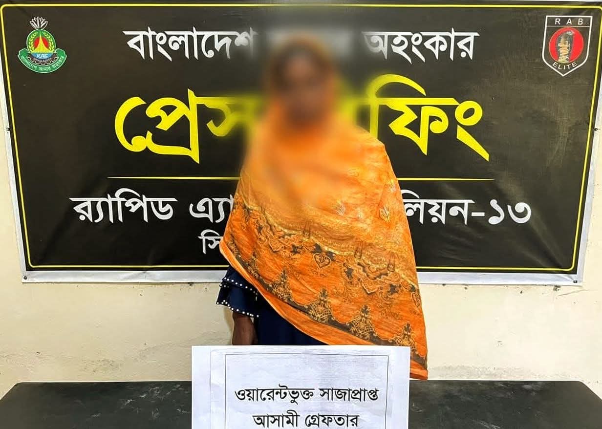 সংবাদ বিজ্ঞপ্তিতে জানানো হয়, গোপন সংবাদের ভিত্তিতে র্যাব-১৩ এর একটি অভিযানিক দল দুপুরে জেলা শহরের পলাশপাড়া এলাকায় মশিউর রহমানের মুদির দোকানের সামনে অভিযান চালায়। এ সময় পরোয়ানাভুক্ত সাজাপ্রাপ্ত পলাতক আসামি কাঞ্চন বেগম (৪০) কে গ্রেফতার করা হয়। তিনি ওই এলাকার সুলতান আহমেদের স্ত্রী।