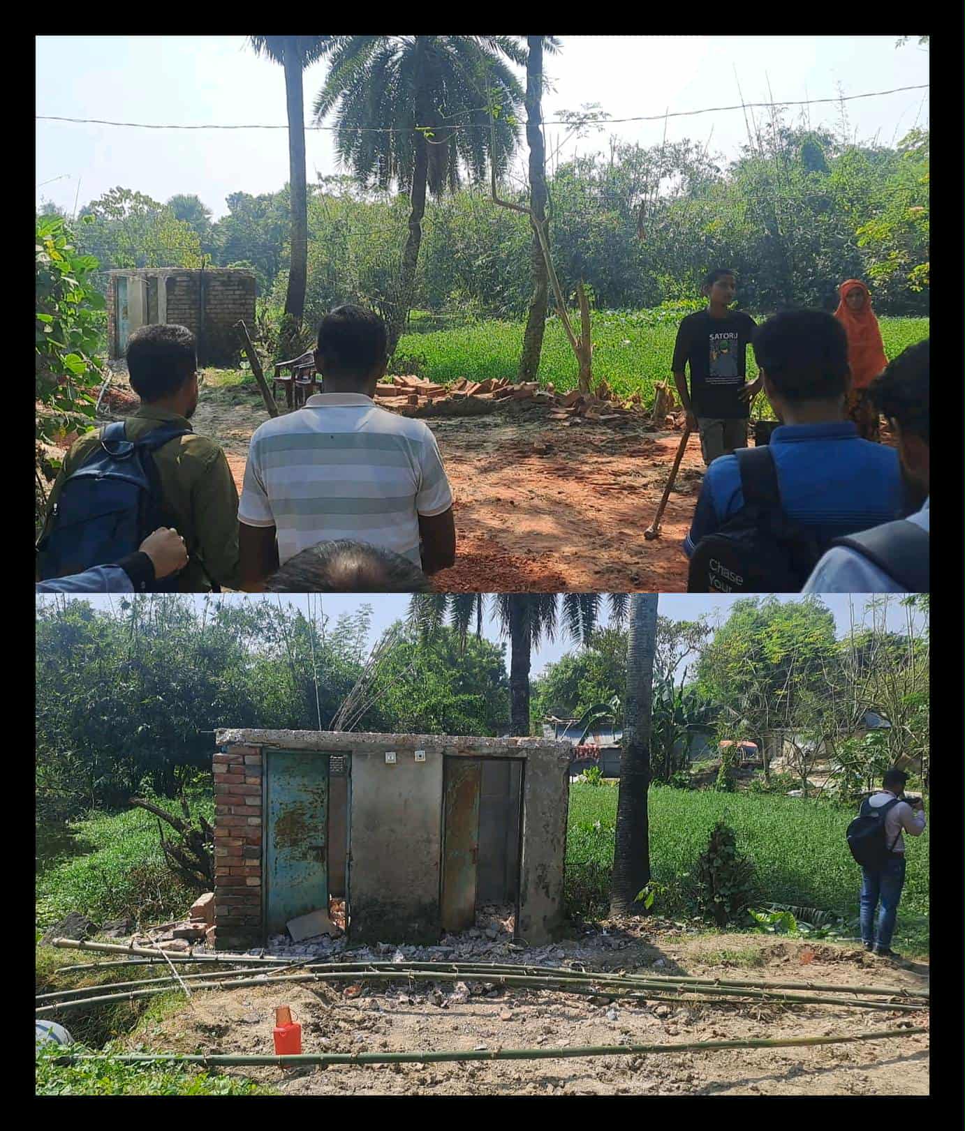 সরেজমিনে গিয়ে দেখা যায়, শরিফুল ইসলাম তার পরিবার ও কিছু লোকজন নিয়ে হাম্বল, কোদাল, খুন্তি ও দা হাতে কাজ করছিলেন। সাংবাদিকদের উপস্থিতি টের পেয়ে তারা সেখান থেকে পালিয়ে যান। ঘটনাস্থলে ছড়িয়ে-ছিটিয়ে থাকা ইট, খোয়া ও ক্ষতিগ্রস্ত স্থাপনা দেখা যায়।