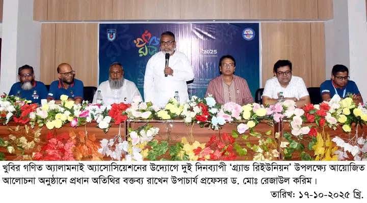 ‘গ্র্যান্ড রিইউনিয়ন’ উপলক্ষ্যে বেলা ১১টায় ৩নং একাডেমিক ভবনের মাল্টিপারপাস রুমে আলোচনা অনুষ্ঠানের আয়োজন করা হয়। অনুষ্ঠানে প্রধান অতিথি হিসেবে বক্তব্য রাখেন উপাচার্য প্রফেসর ড. মোঃ রেজাউল করিম। তিনি বলেন, গণিত ছাড়া আধুনিক সভ্যতার কোনো ক্ষেত্রই সচল নয়। আজকের বিশ্বে কৃত্রিম বুদ্ধিমত্তা (এআই), মেশিন লার্নিং, ডেটা সায়েন্স ও আধুনিক প্রযুক্তির প্রতিটি ক্ষেত্রেই গণিত হচ্ছে মূল চালিকাশক্তি। খুলনা বিশ্ববিদ্যালয়ের গণিত ডিসিপ্লিনের অ্যালামনাইরা দেশে-বিদেশে এসব অগ্রসর ক্ষেত্রেও সাফল্যের সঙ্গে কাজ করে বিশ্ববিদ্যালয়ের মর্যাদা বৃদ্ধি করছেন।