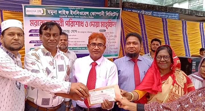 যমুনা লাইফ ইনসিওরেন্স কোম্পানীর মরনোত্তর দাবী চেক পাবনার ফরিদপুর উপজেলার সাংগঠনিক কার্যালয়ে থেকে প্রদান করেন।