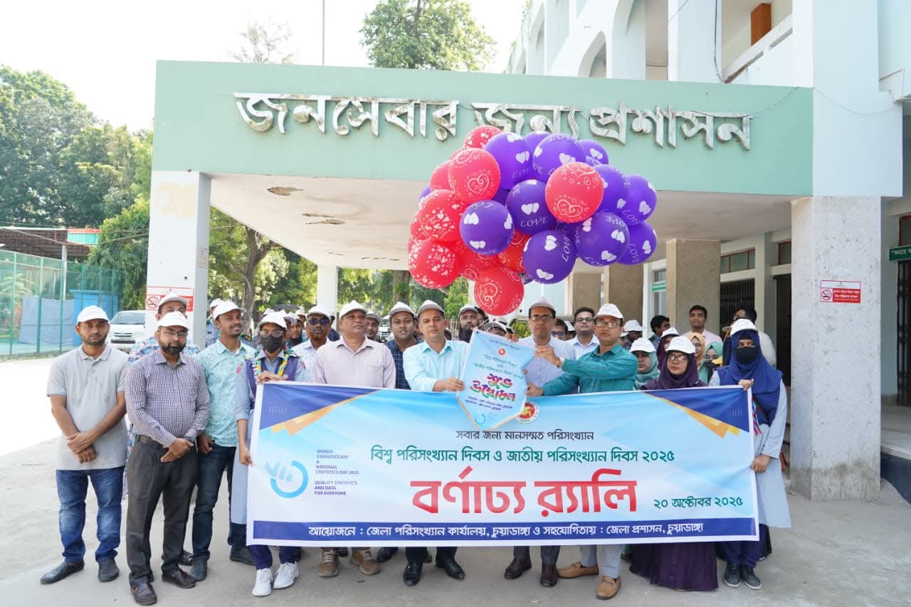 ‘সবার জন্য মানসম্মত পরিসংখ্যান” এই প্রতিপাদ্যকে সামনে রেখে চুয়াডাঙ্গায় বিশ্ব পরিসংখ্যান দিবস ও জাতীয় পরিসংখ্যান দিবস উদযাপিত হয়েছে। সোমবার (১৯ অক্টোবর) সকাল সাড়ে ১০টায় জেলা প্রশাসকের কার্যালয় চত্বরে বেলুন উড়িয়ে দিবসটির উদ্বোধন করেন জেলা প্রশাসক মোহাম্মদ জহিরুল ইসলাম। পরে সেখান থেকে একটি বর্ণাঢ্য র্যালি বের হয়ে শহরের কোর্টমোড় প্রদক্ষিণ শেষে জেলা প্রশাসকের কার্যালয়ে এসে শেষ হয়। পরে জেলা প্রশাসকের সম্মেলন কক্ষে আলোচনা সভা অনুষ্ঠিত হয়। এতে সভাপতিত্ব করেন অতিরিক্ত জেলা প্রশাসক (সার্বিক) আহমেদ মাহবুব উল ইসলাম এবং সঞ্চালনা করেন জেলা পরিসংখ্যান কার্যালয়ের ভারপ্রাপ্ত উপপরিচালক শরিফুল ইসলাম।