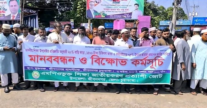 শিক্ষা উপদেষ্টার প্রতিশ্রুতি অনুযায়ী ২০% বাড়ি ভাড়া, এক হাজার ৫০০ টাকা চিকিৎসা ভাতা ও কর্মচারীদের ৭৫% উৎসব ভাতার প্রজ্ঞাপন জারির দাবিতে চুয়াডাঙ্গার জীবননগরে মানববন্ধন ও বিক্ষোভ অনুষ্ঠিত হয়েছে। এমপিওভুক্ত শিক্ষা জাতীয়করণ প্রত্যাশী জোটের আয়োজনে মঙ্গলবার (২১শে অক্টোবর) সকাল ১১টার সময় জীবননগর বাসস্ট্যান্ডের মুক্তমঞ্চের পাশে মানববন্ধন শেষে পৌর শহরের বিভিন্ন এলাকায় বিক্ষোভ করেন জীবননগর উপজেলার এমপিওভুক্ত সকল শিক্ষাপ্রতিষ্ঠানের শিক্ষক ও কর্মচারীরা। এসময় শিক্ষক-কর্মচারীরা বিভিন্ন স্লোগান দেন এবং শিক্ষা উপদেষ্টা প্রতিশ্রুত বাড়ি ভাড়া, চিকিৎসা ভাতা ও উৎসব ভাতার প্রজ্ঞাপন জারির দাবি জানান। মানববন্ধন ও বিক্ষোভ শেষে উপজেলা নির্বাহী কর্মকর্তার কাছে স্মারকলিপি প্রদান করা হয়