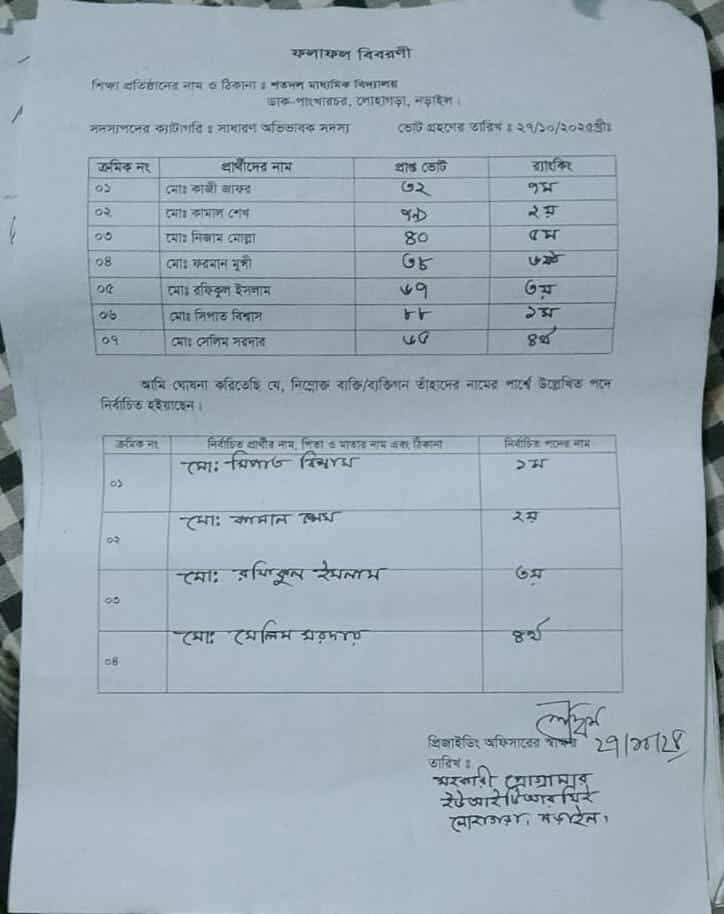 দ্বিতীয় স্থান অর্জন করেন মো. কামাল শেখ (৭৯ ভোট), তৃতীয় হন বিএনপি-জামায়াত সমর্থিত প্যানেলের মো. রফিকুল ইসলাম (৬৭ ভোট) এবং চতুর্থ হন মো. সেলিম সরদার (৬৫ ভোট)।