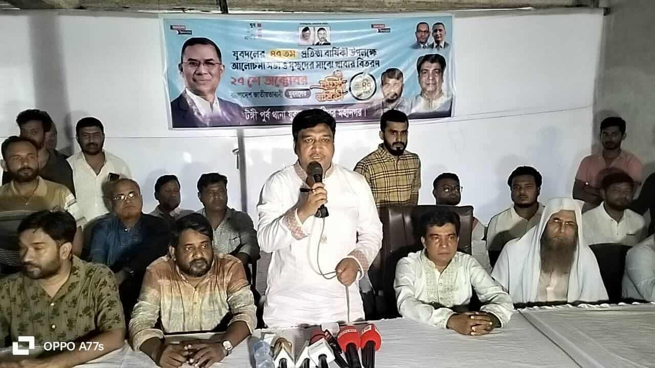 গণতন্ত্র পুনরুদ্ধার, জনগণের অধিকার প্রতিষ্ঠা ও দেশনেত্রী বেগম খালেদা জিয়ার মুক্তির লক্ষ্যে সংগঠনের আদর্শে দৃঢ় থেকে টঙ্গীতে যথাযোগ্য মর্যাদায় পালিত হয়েছে বাংলাদেশ জাতীয়তাবাদী যুবদলের ৪৭তম প্রতিষ্ঠাবার্ষিকী। টঙ্গী মধুমিতা মেগাসিটি দ্বিতীয় তলায় আলোচনা সভা ও দুঃস্থদের মাঝে খাবার বিতরণ অনুষ্ঠানের আয়োজন করা হয়েছে। টঙ্গী পূর্ব থানা যুবদলের আহ্বায়ক আকবর হোসেন ফারুকের সভাপতিত্বে এবং যুবদল নেতা মোক্তাদীর আহম্মেদ লিপু মোল্লার সঞ্চালনায় যুবদলের ৪৭ তম প্রতিষ্ঠা বাষিকী উপলক্ষে আলোচনা সভা ও খাবার বিতরন অনুষ্ঠানে প্রধান অতিথি হিসেবে বক্তব্য রাখেন টঙ্গী পূর্ব থানা বিএনপি সভাপতি ,গাজীপুর -৬ আসনের বিএনপির মনোনয়ন প্রত্যাশী সরকার জাবেদ আহমেদ সুমন। বিশেষ অতিথি হিসেবে বক্তব্য রাখেন টঙ্গী পূর্ব থানা যুবদলের যুগ্ম আহ্বায়ক বেনজির রহমান খান পিন্টু, সহ-সাংগঠনিক সম্পাদক মাসুদ রানা, অন্যতম সদস্য রাজিব বিন সাঈদ রিগান, গাজীপুর মহানগর স্বেচ্ছাসেবক দলের সাবেক যুগ্ম আহবায়ক মোঃ সিরাজুল ইসলাম সাথী, আলহাজ্ব আমান উল্লাহ গাজী, রাজন মাহমুদ প্রমুখ। এছাড়াও উপস্থিত ছিলেন ৫৬ নং ওয়ার্ড যুবদলের সভাপতি আবুল হোসেন, সাধারণ সম্পাদক সালাউদ্দিন মোল্লা, সহ-সভাপতি মামুনুর রহমান চীন, দেলোয়ার হোসেন দেলু, সিনিয়র যুগ্ম সাধারণ সম্পাদক আব্দুস সালাম, কাজী শাহিন, ৪৮ নং ওয়ার্ড যুবদলের সিনিয়র সহ-সভাপতি শাকিল হোসেন, সহ-সভাপতি কামাল খান, যুবদল নেতা রাজন মাহমুদ, মোফাজ্জল উদ্দিন সরকার বিজয়, রেজাউল করিম রানা, রিয়াদ, মামুন ঢালী, আলমগীর হোসেন, শামীম হোসেন, আবুল কালাম আজাদসহ স্থানীয় নেতৃবৃন্দ। অনুষ্ঠানে বক্তারা বলেন, যুবদল হচ্ছে শহীদ প্রেসিডেন্ট জিয়াউর রহমানের আদর্শের ধারক ও বাহক। গণতন্ত্র, ন্যায়বিচার ও দেশের স্বাধীনতা রক্ষায় যুবদল অতীতের মতো ভবিষ্যতেও অগ্রণী ভূমিকা পালন করবে। বক্তারা আরও বলেন,যুবসমাজই জাতির ভবিষ্যৎ। অন্যায়ের বিরুদ্ধে রুখে দাঁড়াতে ও গণতন্ত্র প্রতিষ্ঠায় যুবদল সবসময় প্রস্তুত থাকবে। শেষে সংগঠনের প্রতিষ্ঠাবার্ষিকী উপলক্ষে দুঃস্থদের মাঝে খাবার বিতরণ করা হয় এবং দেশ ও দলের উন্নতি কামনায় দোয়া অনুষ্ঠিত হয়।