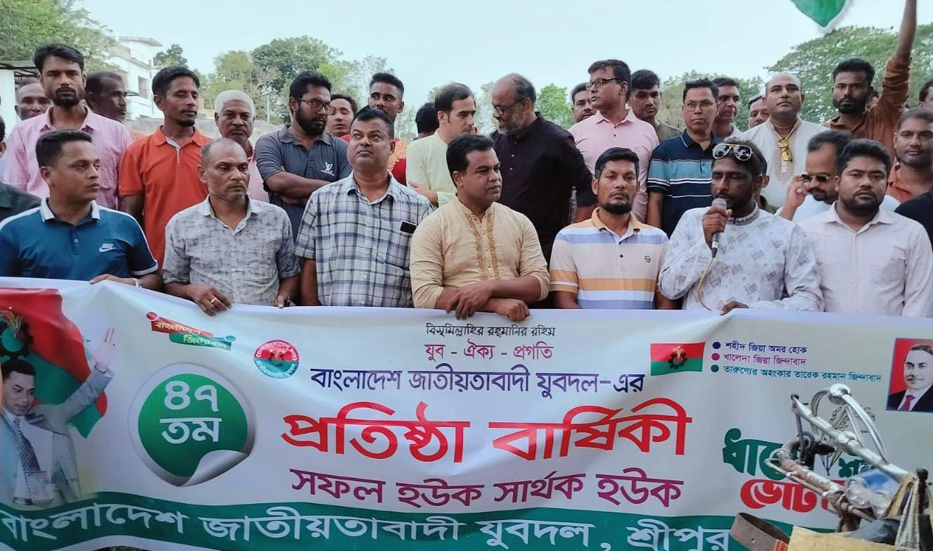 বাংলাদেশ জাতীয়তাবাদী যুবদলের ৪৭ তম প্রতিষ্ঠাতা বার্ষিক উপলক্ষে মাগুরার শ্রীপুরে উপজেলা যুবদলের আয়োজনে বর্ণাঢ্য র্যালী ও আলোচনা সভা অনুষ্ঠিত হয়েছে। এ উপলক্ষে ২৯ অক্টোবর বুধবার বিকালে উপজেলার শ্রীপুর সরকারি এম সি পাইলট মাধ্যমিক বিদ্যালয়ের সামনে থেকে বর্ণাঢ্য র্যালি বের হয়ে শহরের বিভিন্ন গুরুত্বপূর্ণ সড়ক প্রদক্ষিণ শেষে উপজেলা পরিষদ চত্বরের সামনে এসে আলোচনা সভায় মিলিত হয়।
