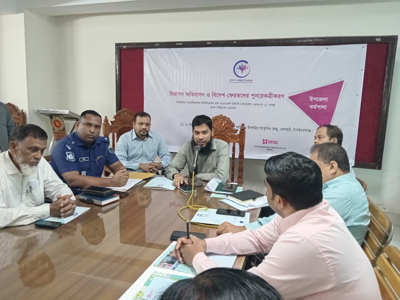 আজ বৃহস্পতিবার (৩০ অক্টোবর ২০২৫) চাঁপাইনবাবগঞ্জের ভোলাহাট উপজেলায় ইউরোপীয় ইউনিয়ন ও ব্র্যাকের যৌথ অর্থায়নে বাস্তবায়িত ইমপ্রূভড সাসটেইনেবল রিইন্টিগেশন অব বাংলাদেশি রিটার্নি মাইগ্রেন্টস (প্রত্যাশা-২) প্রকল্পের অধীনে আয়োজিত উপজেলা কর্মশালায় প্রধান অতিথির বক্তব্যে তিনি এই মন্তব্য করেন। নিজ বক্তব্যে তিনি আরও বলেন যথাযথ প্রশিক্ষণ নিয়ে দক্ষ হয়ে বিদেশ গেলে অনিরাপদ অধিবাসন ও মানব পাচারের ঝুঁকি কমে ও বেশি বেতন পাওয়ার পাশাপাশি আরো অনেক সুবিধা পাওয়া যায়। সীমান্তবর্তী উপজেলা হাওয়ায় ভোলাহাটের মানুষের মানব পাচারের ঝুঁকির মধ্যে থাকার বিষয়টি উল্লেখ করে তিনি আরো বলেন, আমাদের সচেতন হয়ে এলাকায় মানব পাচারের ঝুঁকি সম্পর্কে জনসাধারণের মধ্যে সচেতনতা বাড়াতে হবে। এই এলাকার মানুষ সুন্দর জীবনের স্বপ্নে ও পরিবারের উন্নত জীবন নিশ্চিত করতে নিজের সহায়-সম্পদ বিক্রি করে বিদেশে যাই, কিন্তু অনেকেই নানা কারণে ব্যর্থ হয়ে ফেরত আসে। তাই ব্র্যাকের মত আমাদের সবার উচিত বিদেশ থেকে ব্যর্থ হয়ে ফিরে আসা এই মানুষদের পাশে থাকা।