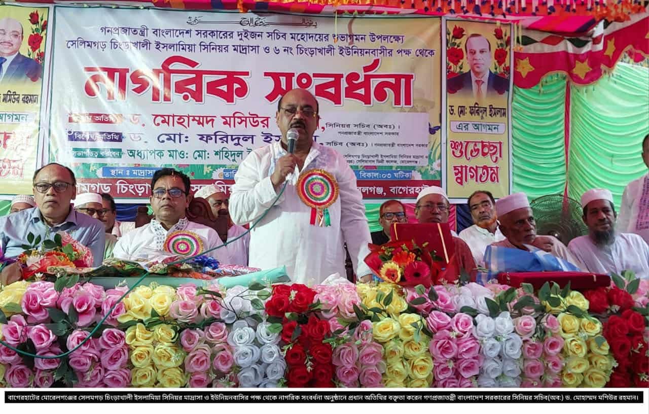 শুক্রবার বিকেলে উপজেলার চিংড়াখালী ইউনিয়নের সেলিমগড় ইসলামিয়া সিনিয়র মাদ্রাসা মাঠে এ নাগরিক সংবর্ধনা অনুষ্ঠানে প্রধান অতিথির বক্তৃতা করেন গণপ্রজাতন্ত্রী বাংলাদেশ সরকারের সিনিয়র সচিব (অব:) মোহাম্মদ মশিউর রহমান।