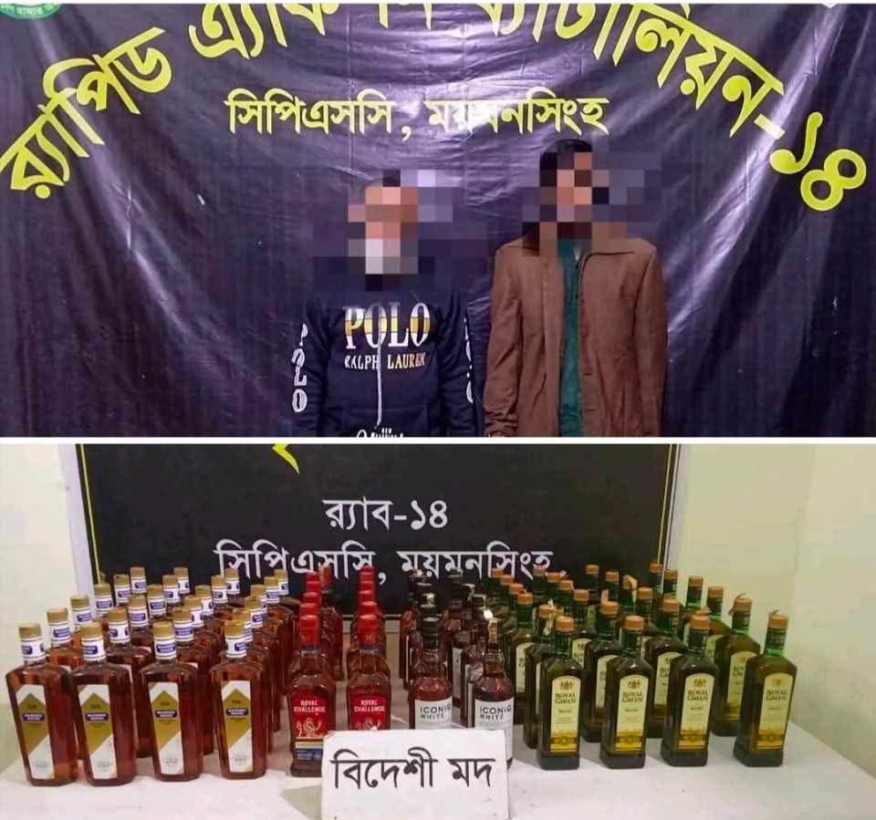 ময়মনসিংহ সিপিএসসি, র্যাব-১৪, কর্তৃক ৭২ (বাহাত্তর) বোতল বিদেশী মদসহ ০২ জন মাদক কারবারিকে গ্রেফতার করা হয়েছে।