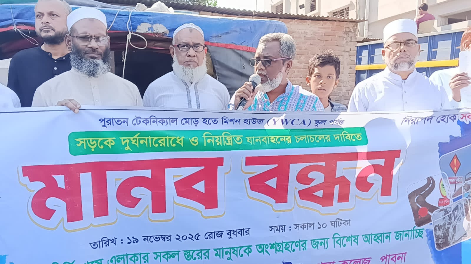 নিরাপদ সড়কের দাবিতে পাবনায় মানববন্ধন পুরাতন টেকনিক্যাল মোড় সড়কে দুর্ঘটনা রোধে নিয়ন্ত্রিত যানবাহন চলাচলের আহ্বান।